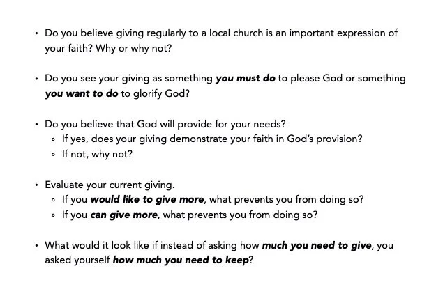 We want you to take some time this week and sit with those, allowing space for the Holy Spirit to speak to you. I especially want to point out that last question, “What would it look like if instead of asking how much you need to give, you asked yourself how much you need to keep?” That’s a tough, but great question that can help us move from giving regularly to living contently and then giving generously.